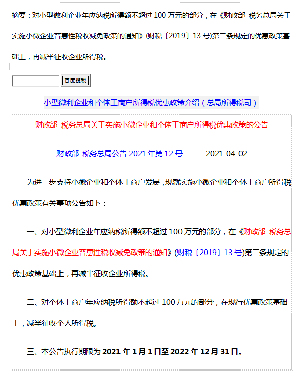财政部 税务总局公告2021年第12号 财政部 税务总局关于实施小微企业和个体工商户所得税优惠政策的公告